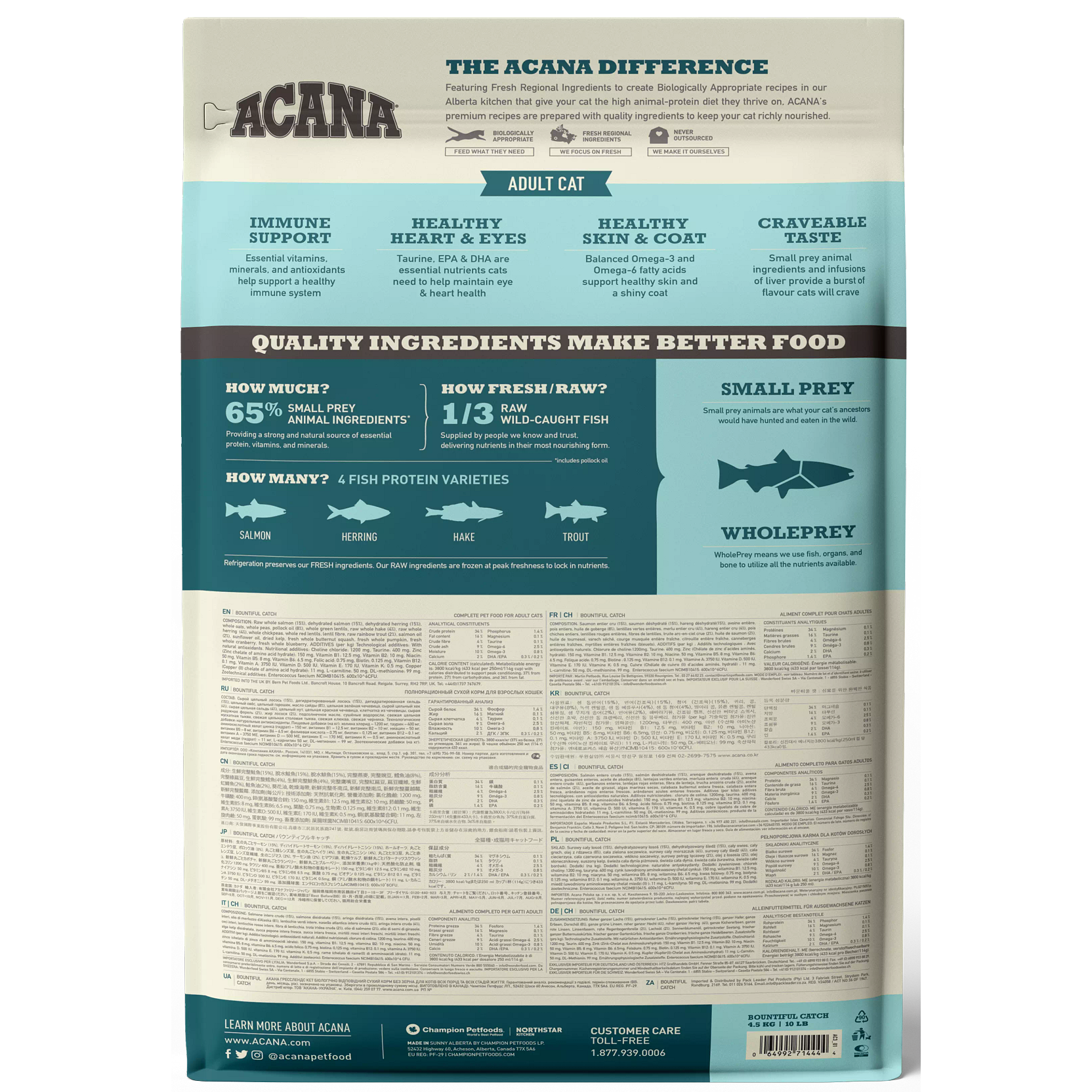 Our ACANA® cat food goes beyond the 1st ingredient™, thoughtfully crafting our recipes from start to finish. Feed your wildcat a diet packed with quality animal ingredients. ACANA® Bountiful Catch recipe is brimming with 65%* quality animal ingredients like responsibly farm-raised salmon, catfish, and wild-caught whole herring, delivered raw in their most nourishing form. Artificial colours, flavours or preservatives are never added in our kitchen.