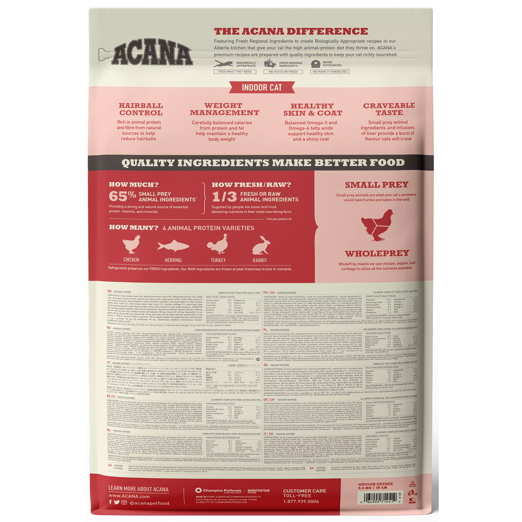 Our ACANA® cat food goes beyond the 1st ingredient™, thoughtfully crafting our recipes from start to finish. Feed your indoor cat a diet packed with quality animal ingredients. ACANA® Indoor Entree recipe is brimming with 65% quality animal ingredients like free-run chicken and turkey, whole herring, and rabbit delivered fresh or raw in their most nourishing form. Artificial colours, flavours or preservatives are never added in our kitchen.