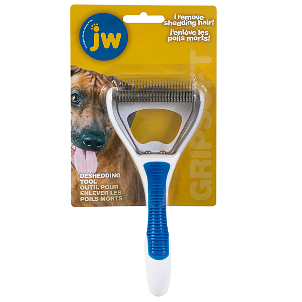 The JW® GripSoft® Dog Deshedding Tool removes large amounts of loose fur and debris to reduce overall shedding and promote healthy skin and coat. Gripsoft technology features non-slip grips and ergonomic handles which are made to optimize comfort and control while grooming your pet. Long-lasting and durable stainless steel blades provide years of use. Regular use will decrease the amount of shedding around the house by removing large patches of unwanted hair at once.