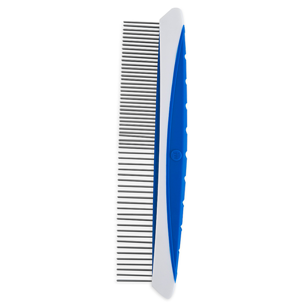 The JW® GripSoft® Fine & Coarse Comfort Grooming Comb features a comfortable rubber-sheathed handle design, which provides extreme non-slip comfort and precision. Designed for fine or coarse coats, this dog grooming comb is great for breaking up unruly mats and easily and comfortably detangles your dog's coat, revealing a beautiful soft, shiny and tangle-free coat. The rounded stainless steel teeth of this specially designed comb rotate 360-degrees to get to those hard to reach places while providing a gentle grooming experience for your pet. An excellent finishing tool to use as part of your grooming routine. Suitable for all breeds and coat types.