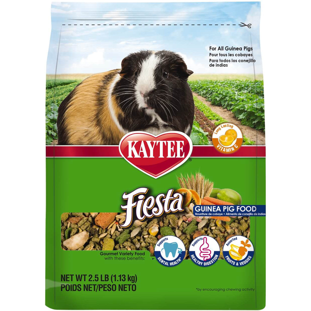 Kaytee Fiesta Guinea Pig food is a nutritionally fortified gourmet diet made of a premium blend of fruits, vegetables, seeds and grains offering maximum variety, fun and nutrition for small animals. Fiesta contains prebiotics and probiotics to support digestive health and is formulated with your small animal species in mind.