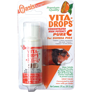 OASIS VITA-DROPS PURE C for GUINEA PIGS are a convenient way to assure your guinea pigs (also known as cavies) are receiving the fresh Vitamin C they require daily. Daily intake of Vitamin C is essential for overall health but most importantly to prevent scurvy. OASIS VITA-DROPS PURE C for GUINEA PIGS is formulated using high-quality, human-grade stabilized Vitamin C.