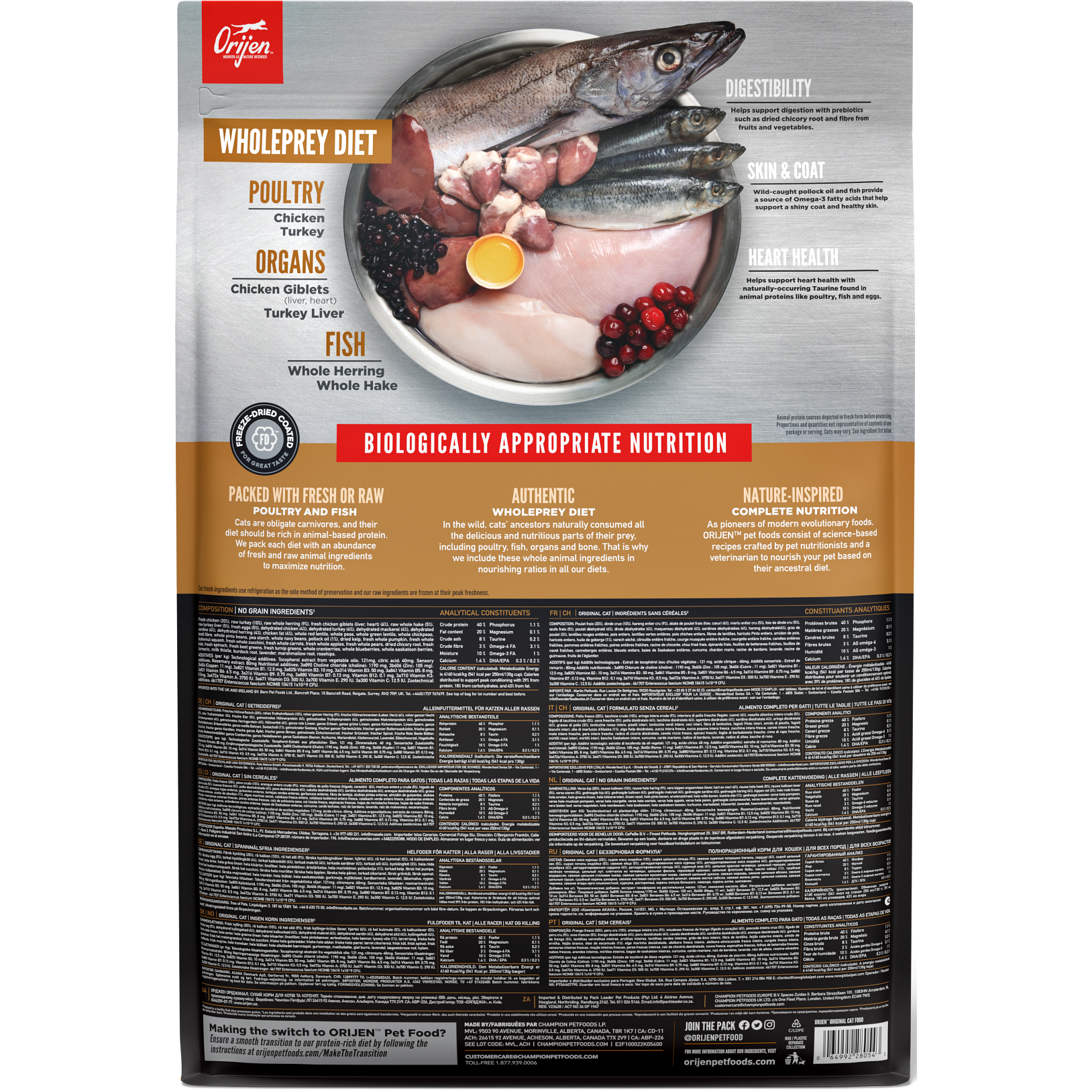 - Our authentic WholePrey diet features the most succulent parts of the prey like poultry or fish, organs and bone to mimic what your cat’s ancestors consumed in the wild.