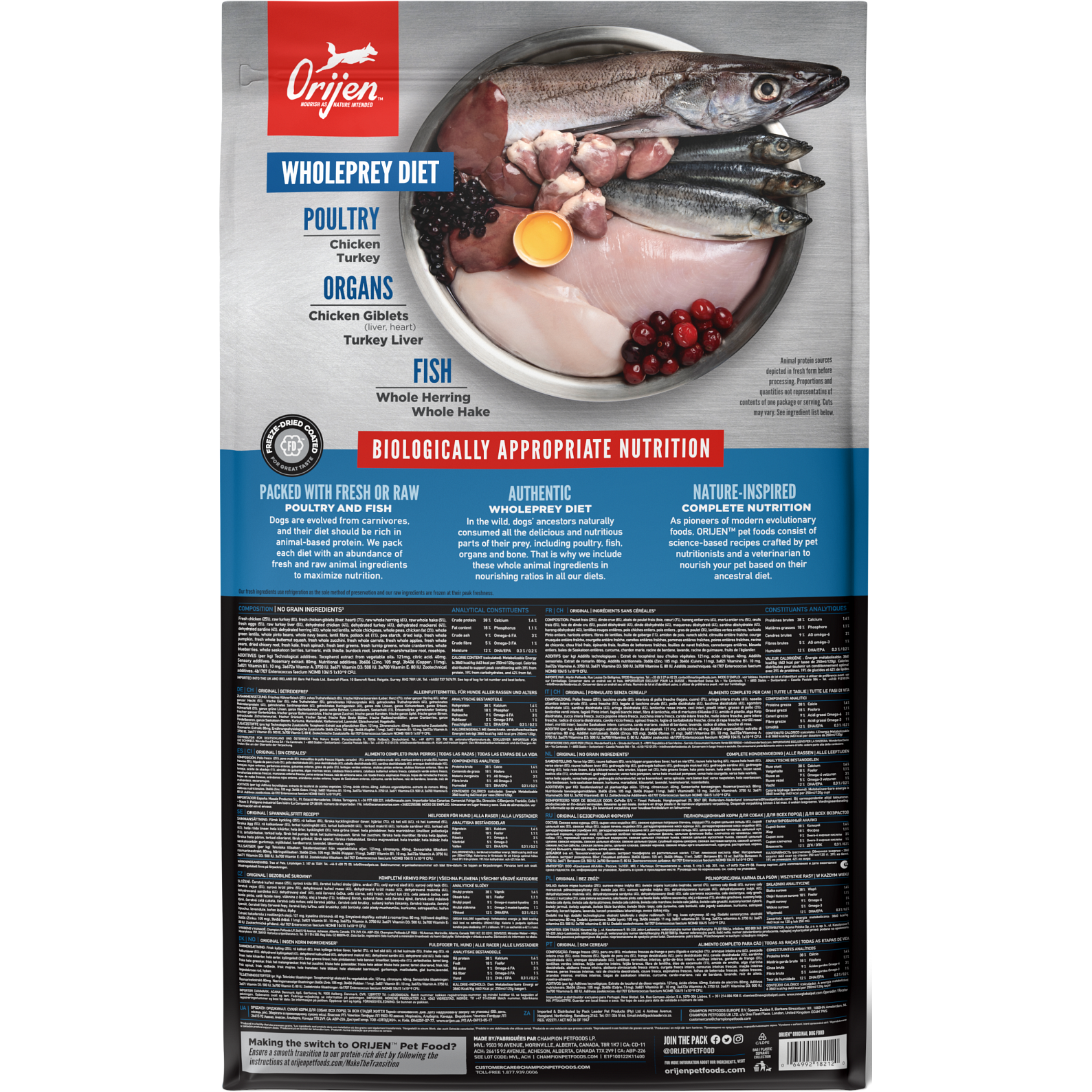 - Our authentic WholePrey diet features the most succulent parts of the prey like poultry or fish, organs and bone to mimic what your dog’s ancestors consumed in the wild.