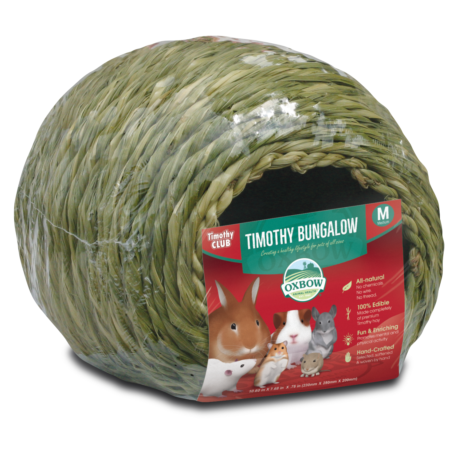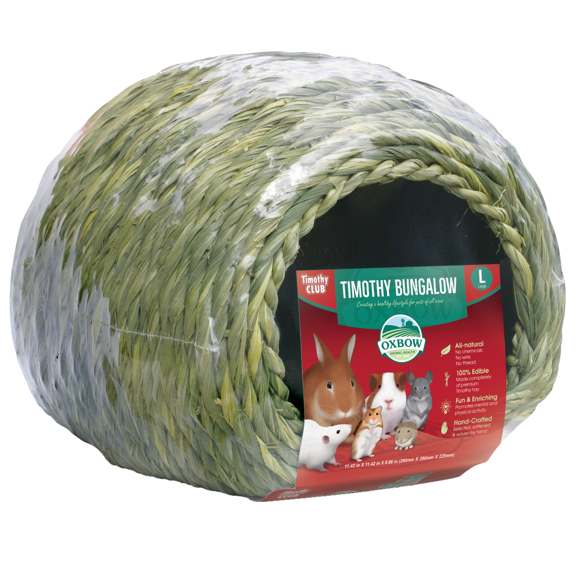 An edible, enriching getaway for your small pet. All small pets need a place to relax and get away from the stress of being a prey species. Our Timothy CLUB Bungalow provides the perfect place for your rabbit, guinea pig, or chinchilla to hide away throughout the day. Every Timothy CLUB is hand-woven from nothing but premium Timothy hay. 100% edible, 100% enriching fun.