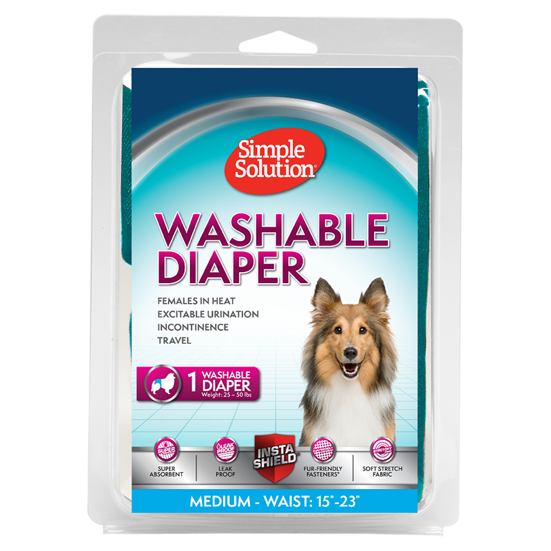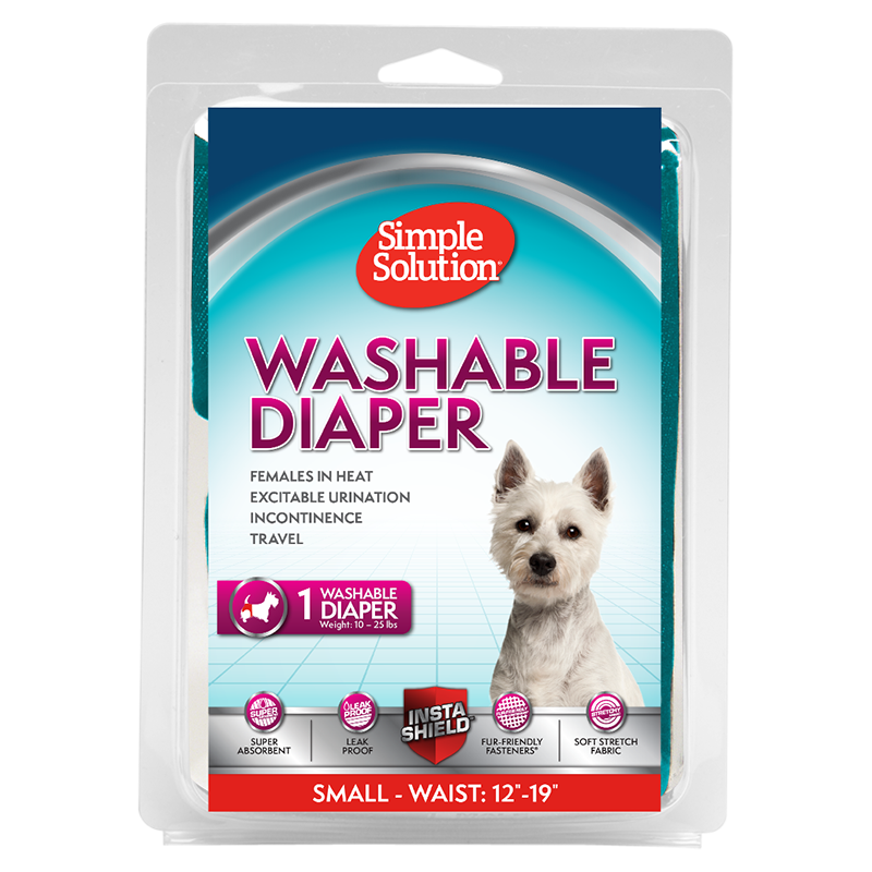 Control the mess of incontinent pets, heat cycles, and housebreaking. Simple Solution Washable Female Dog Diapers are comfy and secure, with soft-stretch fabric and long-lasting leak protection. A microfiber pad absorbs the mess, while a wicking layer keeps your pet dry. The plastic liner keeps your home clean. Use alone for light seasonal flow and urination issues, or with a disposable Simple Solutions Diaper Liner for extra absorption. For male dogs, use Simple Solution Washable Male Wraps.